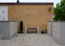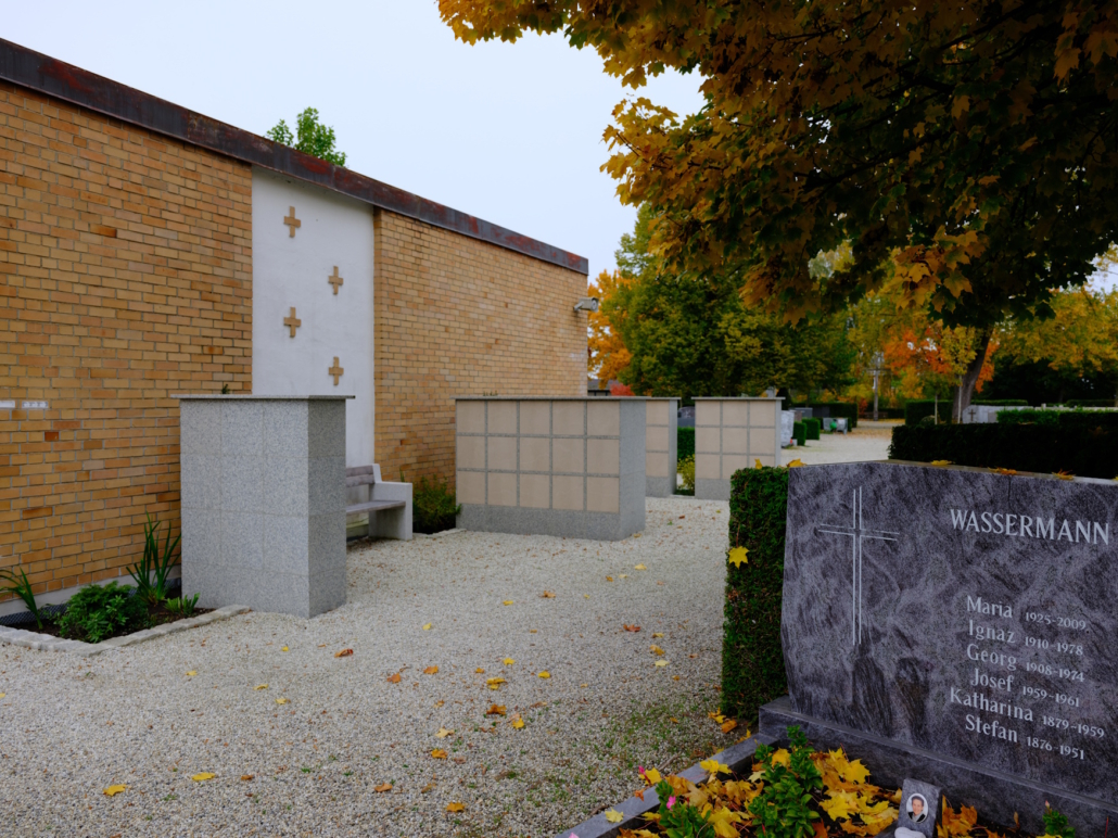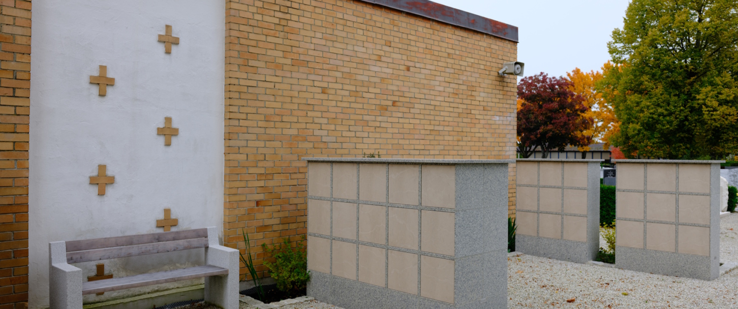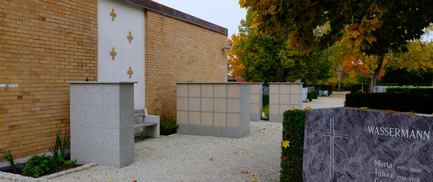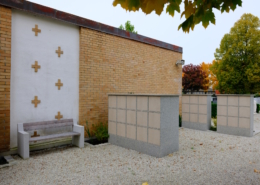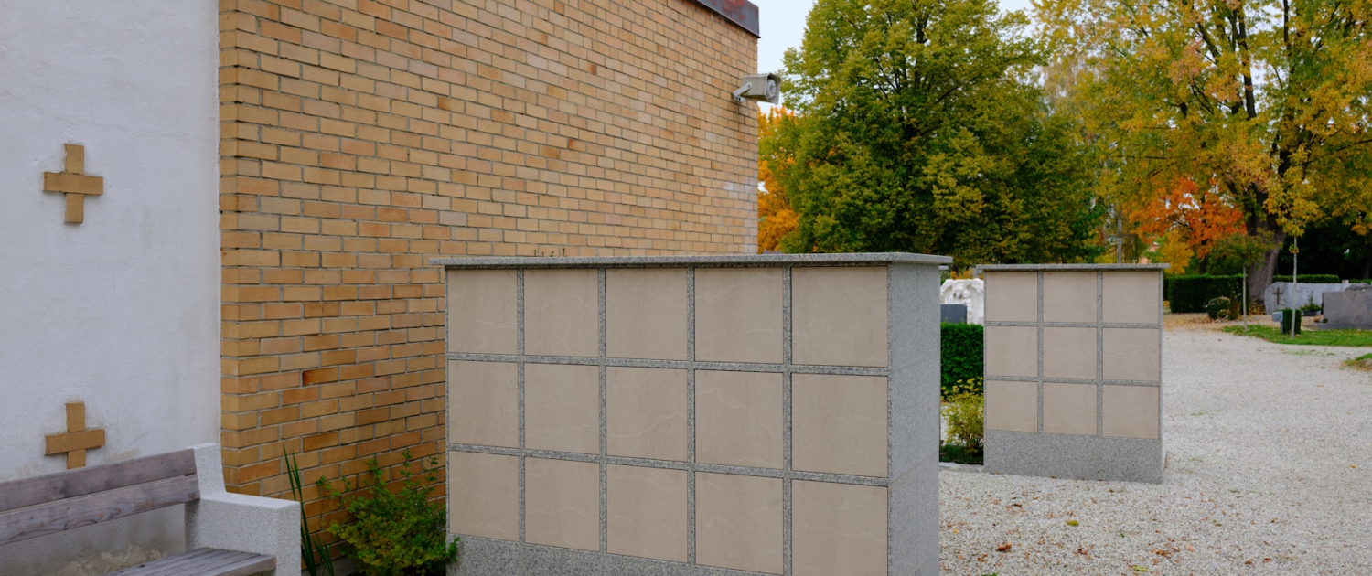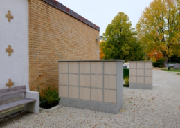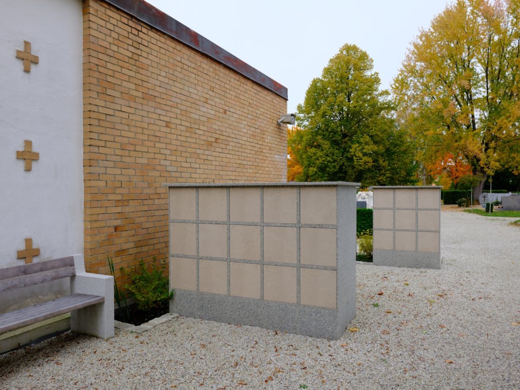 Urnenwand-Anlage System DOM.design, mit Glas-Skulptur und darunter liegender Aschegruft.